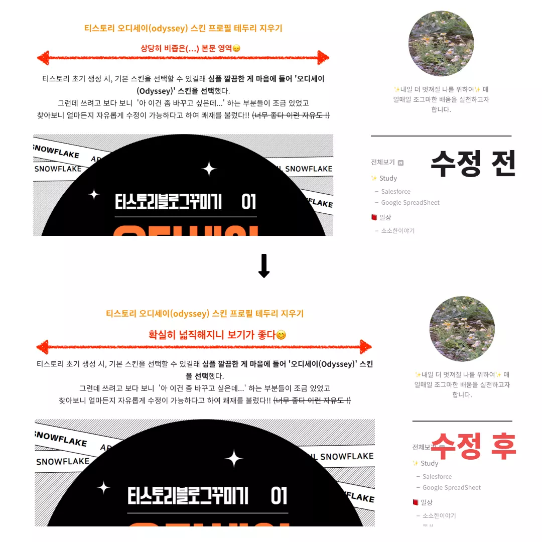 2023.06.19 - [🧡 티스토리/블꾸기록] - 1. 티스토리 오디세이(odyssey) 스킨 프로필 테두리 지우기